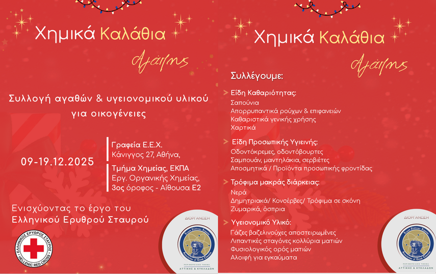 Το Περιφερειακό Τμήμα Αττικής και Κυκλάδων της Ένωσης Ελλήνων Χημικών υλοποιεί τη δράση «Χημικά Καλάθια Αγάπης», με στόχο τη συγκέντρωση αγαθών - ειδών πρώτης ανάγκης και υγειονομικού υλικού που θα ενισχύσουν το έργο του Ελληνικού Ερυθρού Σταυρού και θα στηρίξουν συνανθρώπους μας που βρίσκονται σε ανάγκη.
